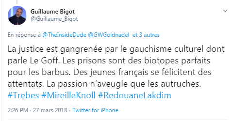 Récidiviste du discours de haine, condamné à plusieurs reprises, avec d’autres procès en cours, Eric Zemmour développe son idéologie xénophobe sans complexe. Lui aussi adepte du complot du “Grand Remplacement”, il en tire une justification à la nécessité d’une réaction forte des pays occidentaux, passant par l’abandon des droits de l’homme quand il s’agit de populations immigrées, déportation forcée, et non assistance lorsque leur vie est menacée. Le spectre de la guerre civile et de l’effondrement civilisationnel qu’il agite en même temps que son islamophobie décomplexée peut pousser des esprits fragiles à une “riposte préventive”, via des actions violentes.